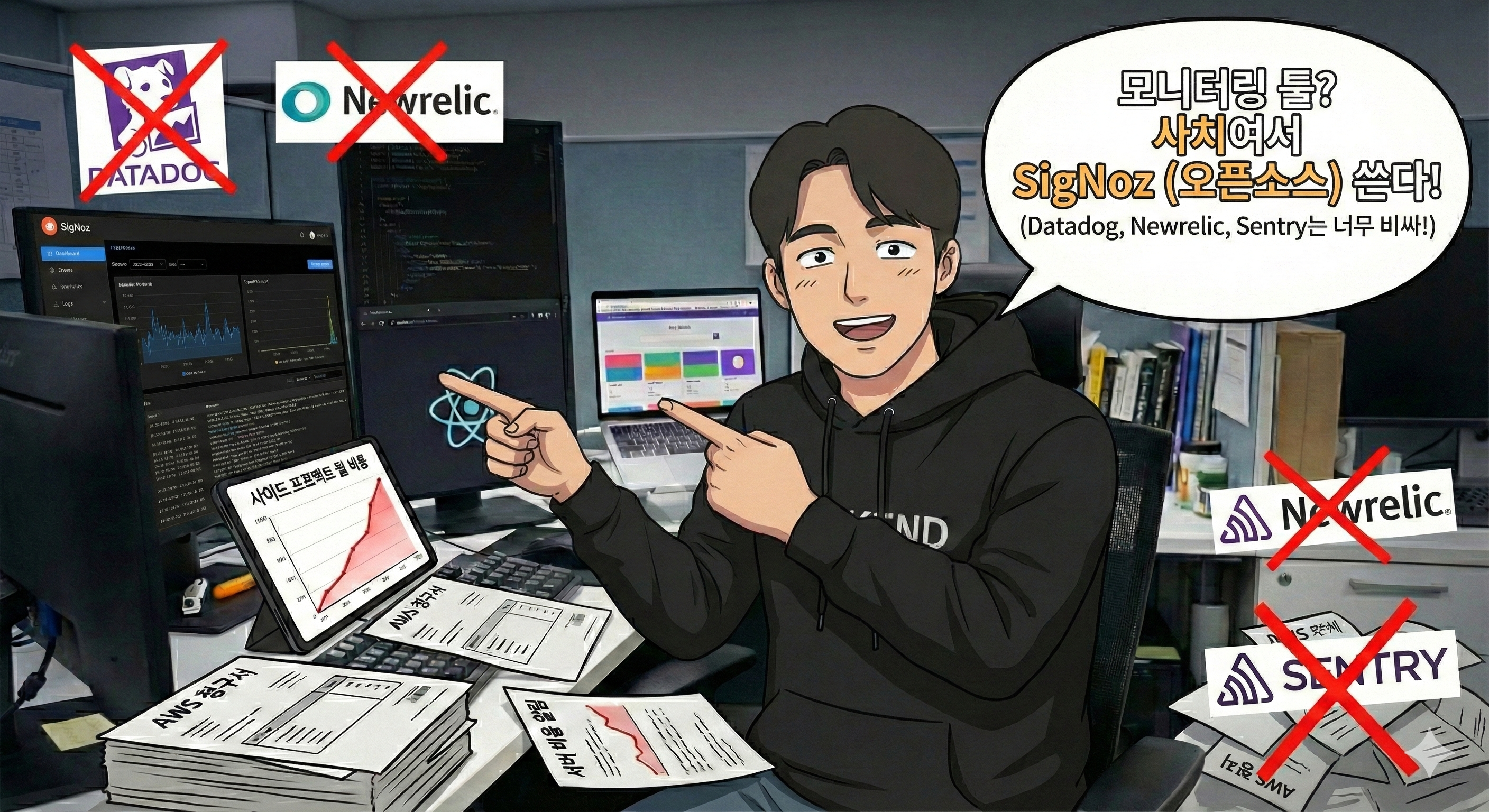 APM 툴에는 DataDog, New Relic, Sentry 등이 있지만, 서버 비용 한 푼도 주기적으로 나가는 게 민감한 필자에게는 사치일 뿐이다.