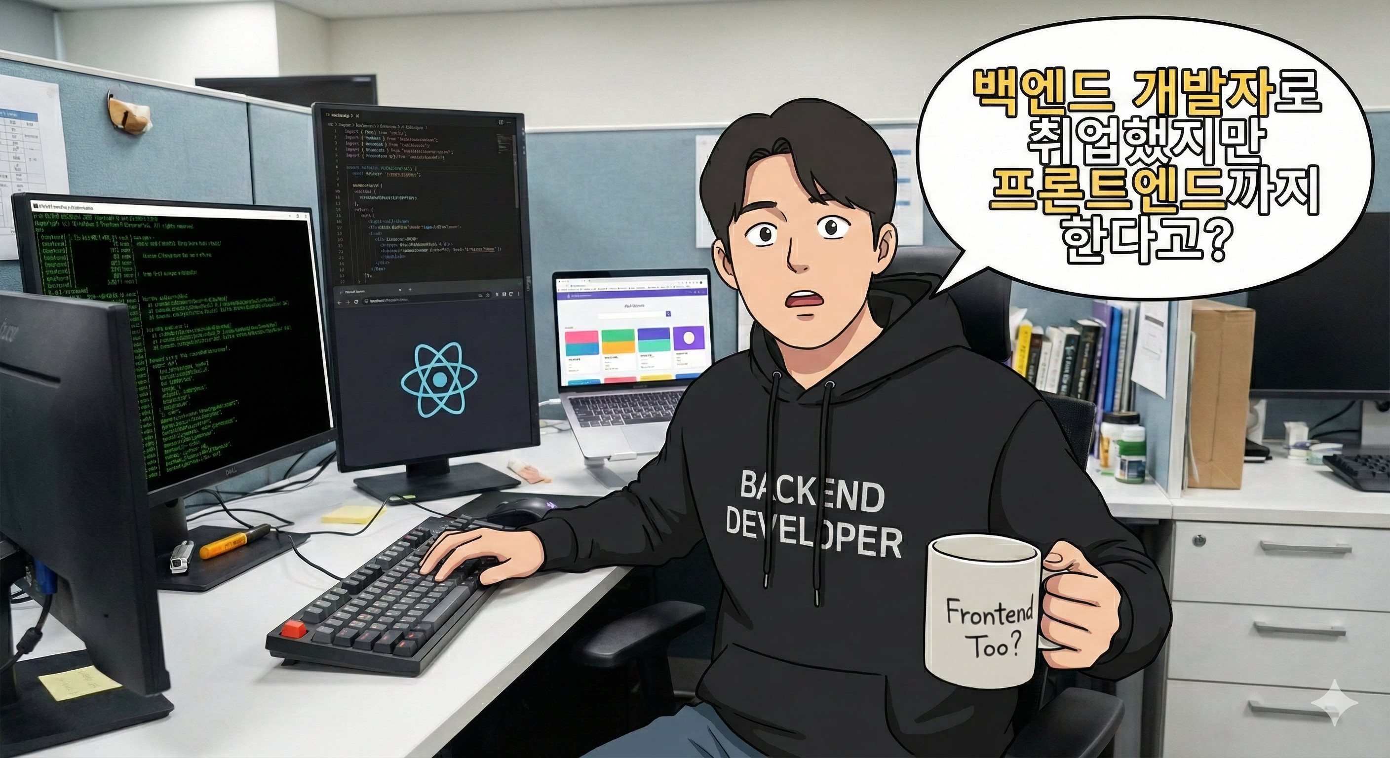그~~~~나마 첫 회사에서 선임이 "어~ FE 도 해보실래요?"라고 말했을 때 "넵!! 하겠습니다."라고 반응한 결과, "백엔드 개발자로 취업했지만 프론트엔드까지 안다고?"라는 소설 같은 시츄에이션이 발생해서, React를 대애애애충 쓸 줄 안다. 물론 React를 심도 있게 다루는 수준이 아니라, 그냥 비즈니스가 돌아가게 만드는 정도.
